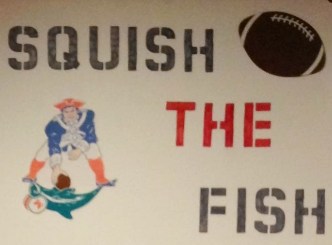 The slogan “Squish the Fish” was ubiquitous. It was printed on t-shirts featuring Pat Patriot stomping on a cartoon dolphin, and inspired hastily-written songs of questionable musical value. “Squish the Fish” signs appeared everywhere; our local supermarket hung one behind the deli counter (or maybe it was their seafood counter?), and at Logan Airport, a simple version scrawled with a black marker on a piece of tan cardboard adorned the right side of the stairs leading to the Eastern Airlines jet that took the New England Patriots down to Florida to play the Miami Dolphins in the 1985 AFC Championship Game.1